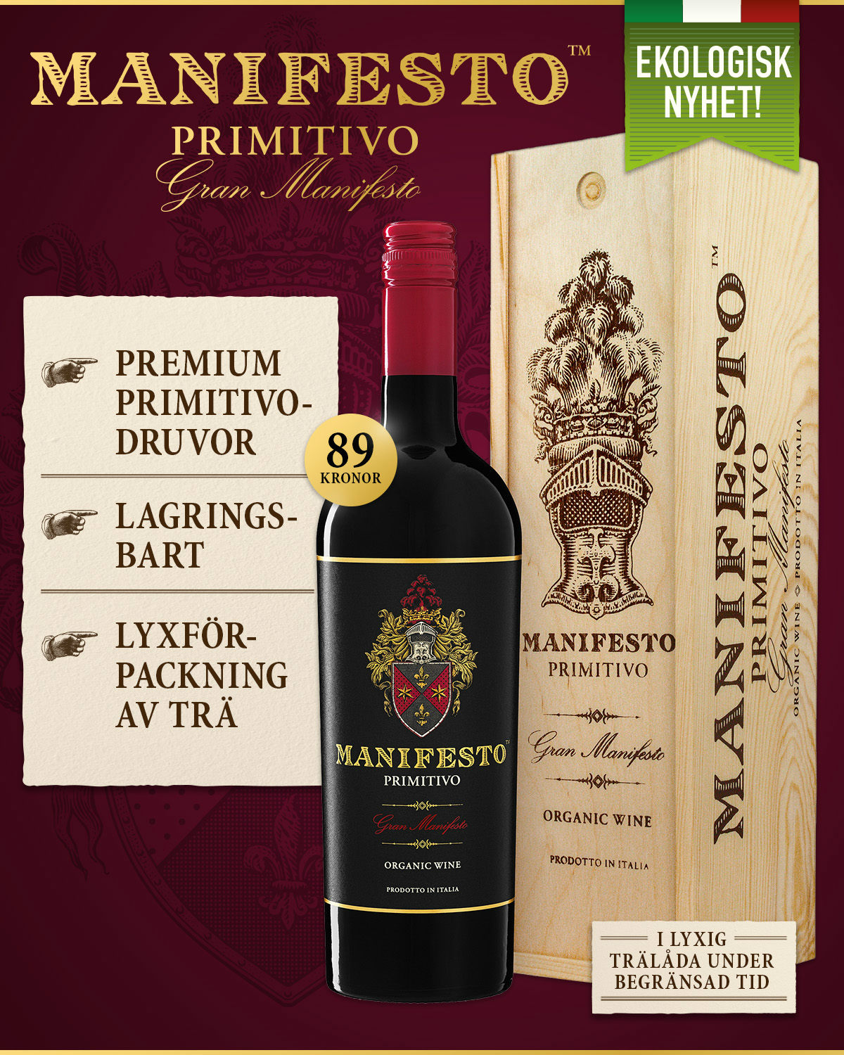 Med den inhemska vindruvan Primitivo från det soliga Italien är Manifesto Gran Primitivo ett fruktigt, fylligt och generöst ekologiskt rött vin! Druvorna handskördas för bästa möjliga kvalité och vinifieras sedan varsamt för att bevara vinets karaktärsfulla charm!
