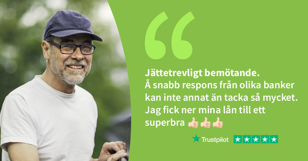 Hej! Vi har hjälpt många kunder att hitta den lägsta räntan bland våra långivare - låt oss hjälpa dig med! | | | | Citatet är verkligt och hämtat från en av våra kunder, men personen på bilden har ingen koppling till detta. | | | | Jämför räntorna hos våra 22 anslutna långivare för att hitta de bästa villkoren för ett lån hos dem. Låna mellan 5 000 kr upp till 600 000 kr – vad du gör med pengarna bestämmer du själv. | | | | 1. Välj belopp 2. Ange information 3. Skicka in ansökan | | | | Skicka in en kostnadsfri ansökan idag, en medarbetare kontaktar dig inom några få timmar. Vi tar endast en kreditupplysning och din ansökan är inte bindande - du väljer själv om du vill acceptera bankens bud eller ej. Vi återkommer till dig personligen när vi har ett eller flera erbjudanden. | | | | Vi jämför och väljer det bästa lånet från dessa långivare: | | | | Individuell ränta från 2,95% - 24%. Exempel: 5,3%. 70 000 kr på 15 år. Eff. ränta 6,54 %. Tot. belopp 108 346 kr. Kostn./mån: 600 kr. Startavg. 495 kr. Avikostn. 35 kr/mån. | | | | |