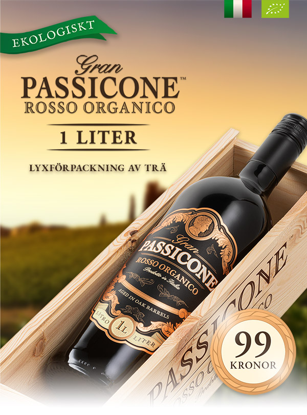 | Ekologisk nyhet i elegant lyxförpackning Nyheten Gran Passicone Rosso Organico i literflaska är ett ungdomligt och generöst fruktigt vin med inslag mörka körsbär, plommon, choklad och fat. Vinet har lagrats på franska ekfat i 6 månader vilket ger vinet en fin textur, härliga aromer och välbalanserad smak av fat Vinet passar utmärkt till kötträtter av nöt, vilt, kyckling och lagrad ost. Vi föreslår en kycklingfilé fylld med parmesan och basilika inlindad i parmaskinka och grillad i ugnen. För att garantera en jämn och hög kvalitet kommer druvorna till detta vin från noggrant utvalda odlare runt om i Italien. Vinet är gjort på de lokala druvsorter Primitivo och Sangiovese. Mörkt rubinröd. med en ungdomlig, fruktig doft med inslag av fat, blåbär, körsbär, färska örter och vanilj. |