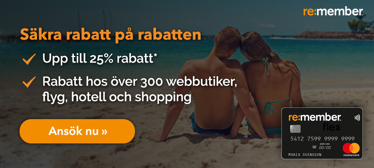 re:member flex: Årsavgift 0 kr. Aviavgift vid e-faktura 0 kr (pappersfaktura 29 kr). Årsräntan sätts individuellt och är 9,74 %-24,74 % (2018-01-01), rörlig. Vid en utnyttjad kredit på 20 000 kr är den effektiva räntan 14,67 % vid betalning med e-faktura. Det sammanlagda belopp som ska betalas är 21 506 kr (avbetalningsbelopp i snitt 1 792 kr/mån). Det sammanlagda beloppet och den effektiva räntan är uträknade utifrån ett exempel där krediten är återbetald på 12 månader, årsräntan är 17,24 %, att 39 räntefria dagar utnyttjas samt att krediten nyttjas utan avgift för kontantuttag och pappersfaktura. Kontantuttag kostar 3 % av uttaget belopp, dock lägst 35 kr per uttag. Valutaväxlingspåslag är 1,75 % på valutakursen. Betalas inte hela kontoskulden på en gång ska kontoskulden återbetalas genom månadsvisa betalningar om lägst 3 %. Inbetalningsbeloppet är dock lägst 200 kr, men högst skulden på kontot. Avtalet gäller tillsvidare och ångerrätt gäller. För fullständiga villkor tryck här. Kreditgivare: EnterCard Group AB (org nr 556673-0585) 105 34 Stockholm. Företaget står under tillsyn av Finansinspektionen. *Reward-rabatten gäller inte för moms- och fraktkostnader. re:member reward gäller inte för dig som har ett re:member more. | | |