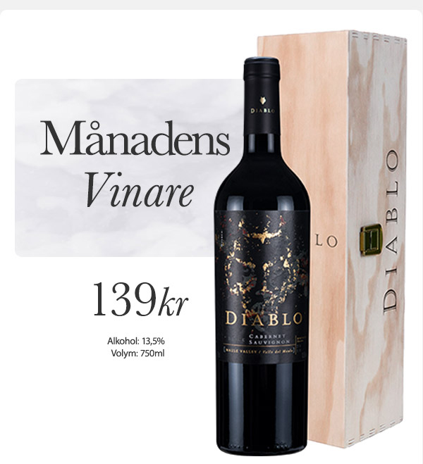 | Månadens populäraste vin Diablo Black Diablo Black Cabernet Sauvignon är ett fylligt och smakrikt rödvin med inbjudande doft av svarta vinbär och björnbär samt toner av örter och vanilj. Vinet har mjuka tanniner och en fruktig eftersmak som sitter i länge. Diablo Black gör sig utmärkt till säsongens mustiga grytor eller varför inte till en klassisk lasagne. . Vinflaskan levereras i en exklusiv trälåda | | Copyright © 2020 Vinklubben, en del av Speqta AB (publ) | |