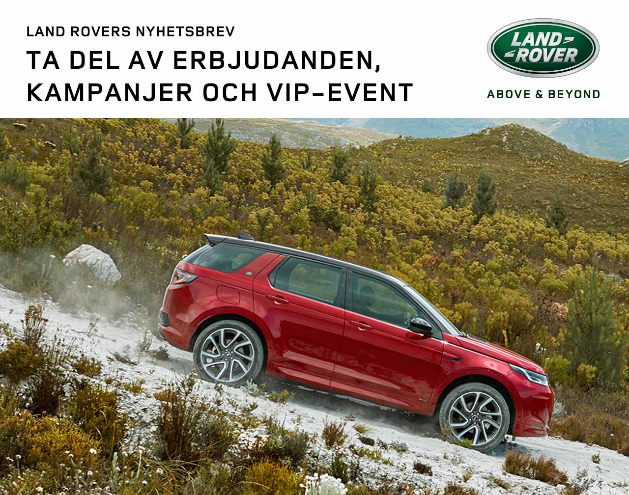 | VILL DU VARA FÖRST MED DET SENASTE? | | | Om du vill vara först på bollen med det allra senaste om Land Rover, ska du prenumerera på vårt nyhetsbrev. Välj att få information om en, ett par eller alla våra bilmodeller! ● Få rykande färska nyheter om Land Rover ● Ta del av unika erbjudanden, kampanjer och VIP-event ● Delta i tävlingar och vinn spännande priser. | | |