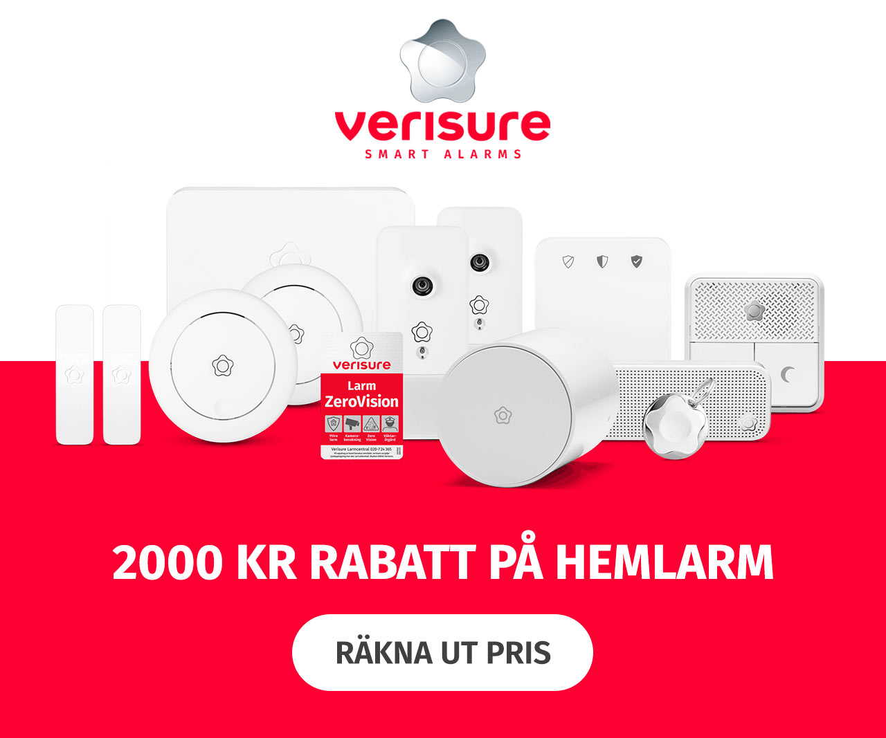 | 2000 kr rabatt på hemlarm | | | Få 2000 kr onlinerabatt på hemlarm för villa och lägenhet. Se villkor på Verisures hemsida. Med ett hemlarm från Verisure får du: • Ett larm som är uppkopplat till Verisures egen larmcentral dygnet runt. • Snabbt rätt åtgärd vid inbrott, brand, olyckor och vattenskador. • ZeroVision rökgenerator som gör att vi kan avbryta inbrott. • Fria väktarutryckningar. • Professionell installation. • Verisure App som gör att du kan styra larmsystemet på distans. • IP kameror som tillval. • Ett larm som är utsett till bäst i test av Hem & Hyra och TT. | | |